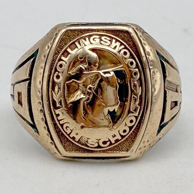 トップは擦れてわかりにくいですが、中世の騎馬のデザインの周りにCOLLINGSWOOD HIGH SCHOOL の学校名が入っています。