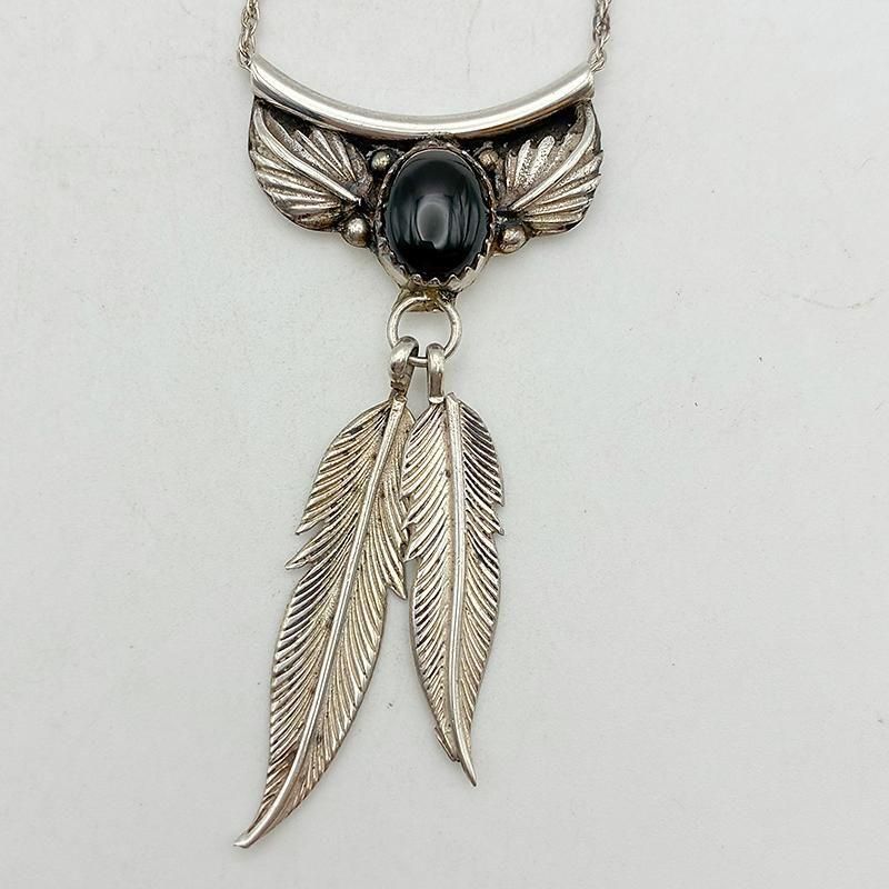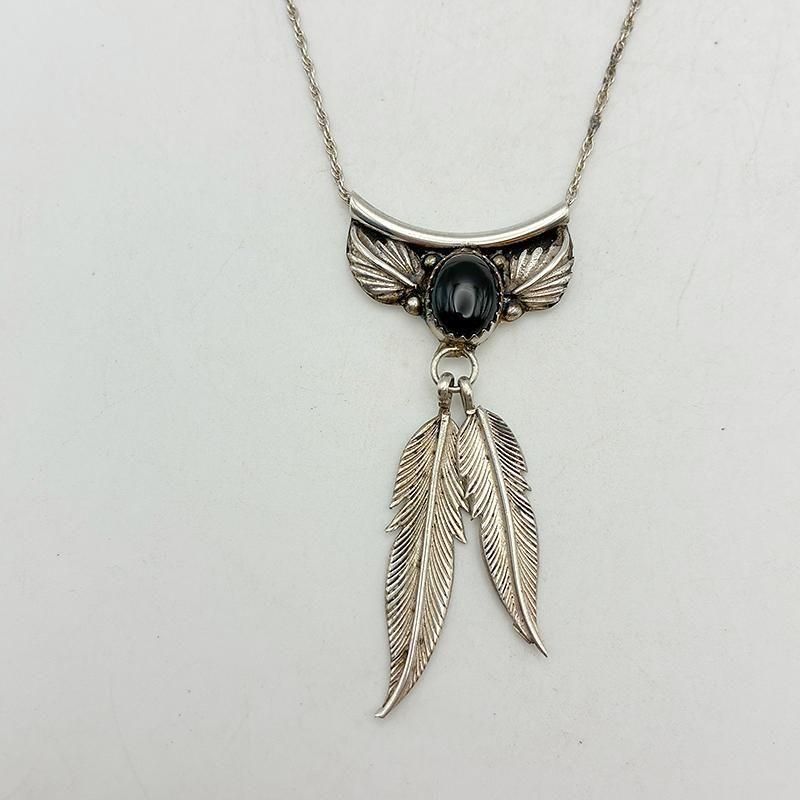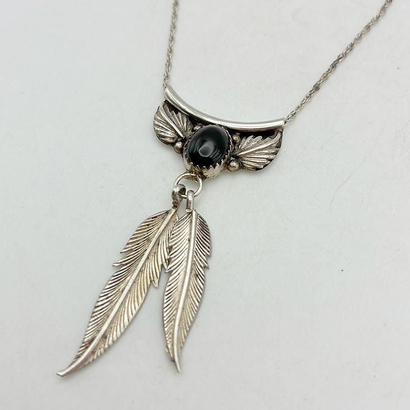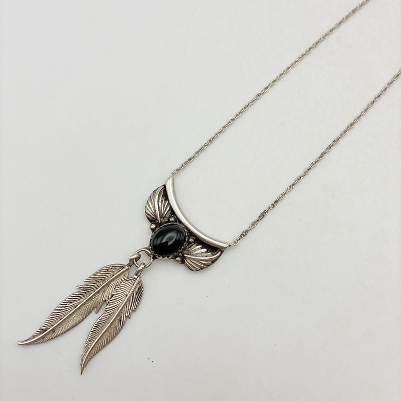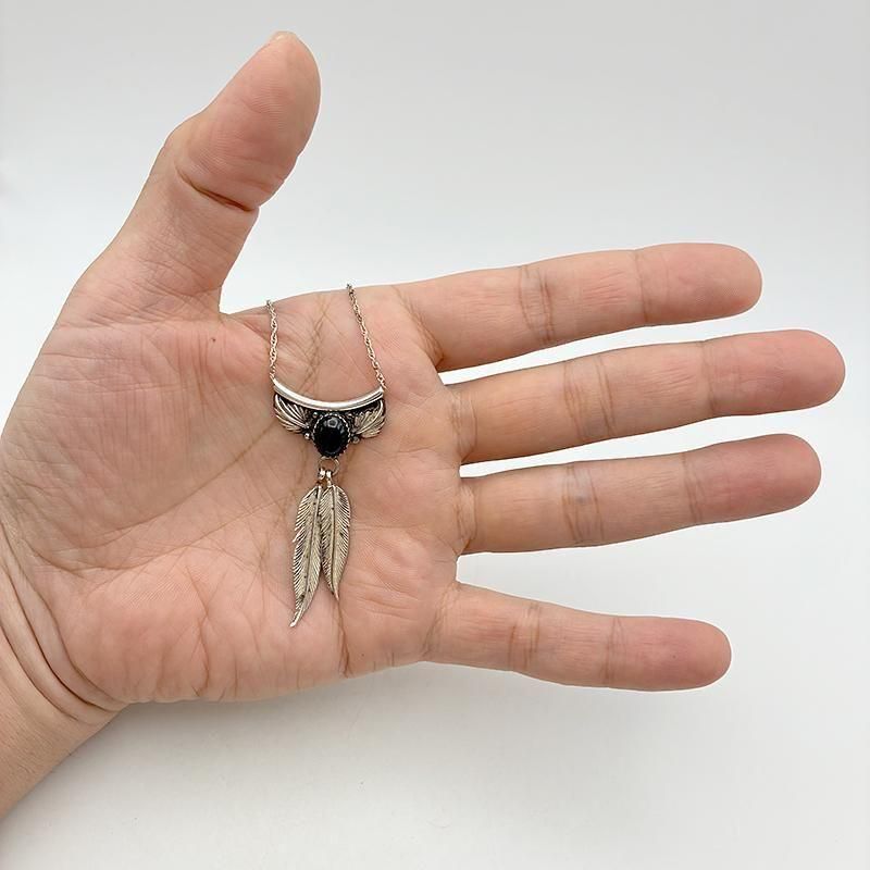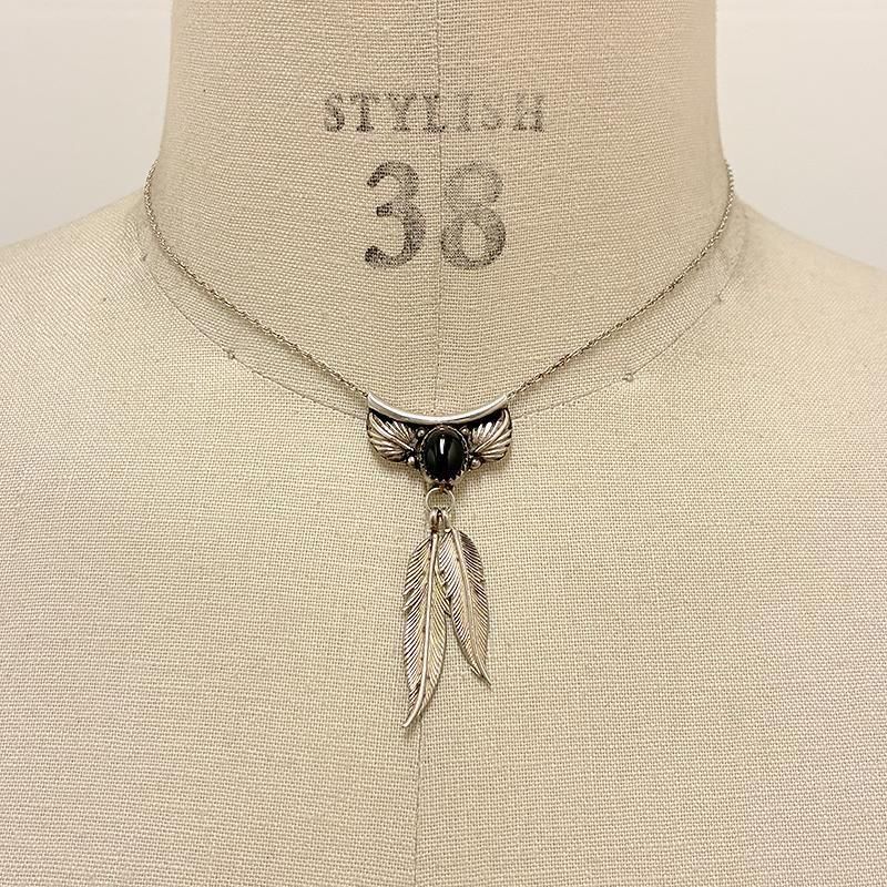 さりげないオニキストップに、動きのあるフェザーがアクセントとなったネックレスです。