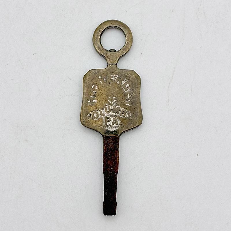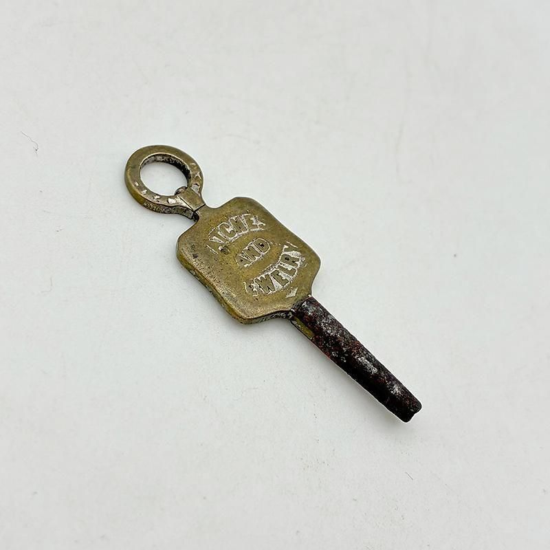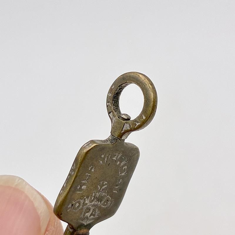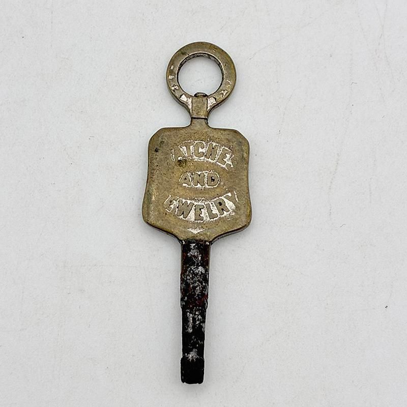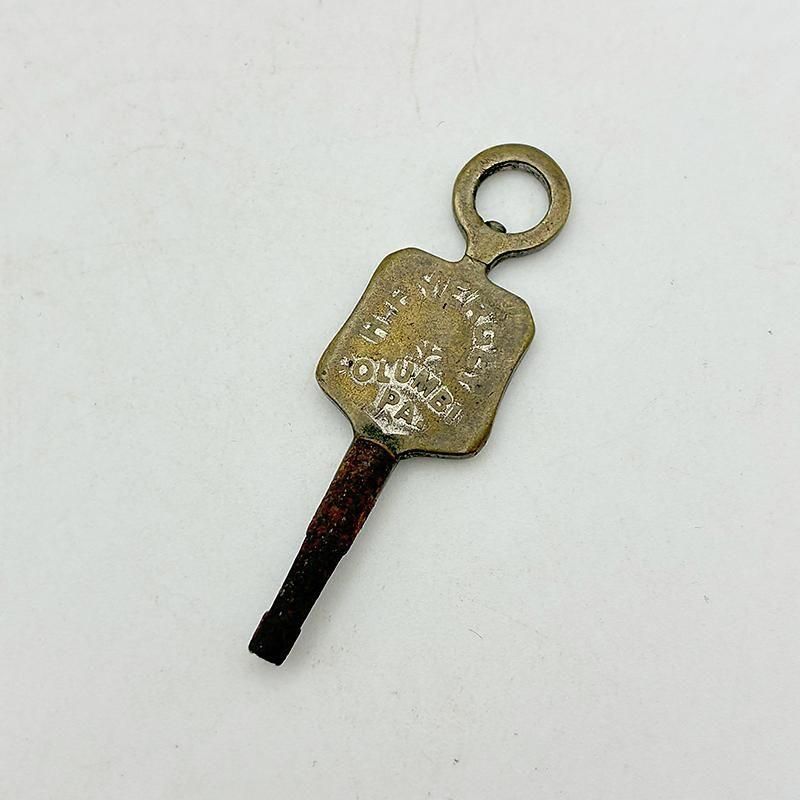 懐中時計のゼンマイ巻き上げなどに使われていたパーツで"H.F. YERGEY WATCH AND JEWELRY" 1870年頃からのアメリカ ペンシルバニア州コロンビアにあった宝石商のアドバタイジングが入っています。