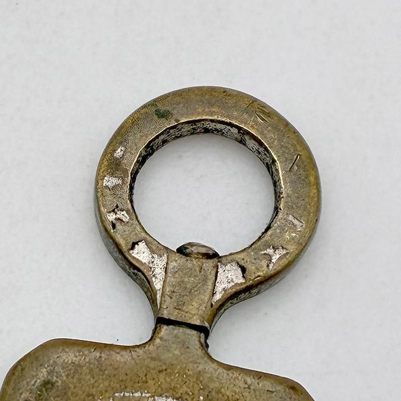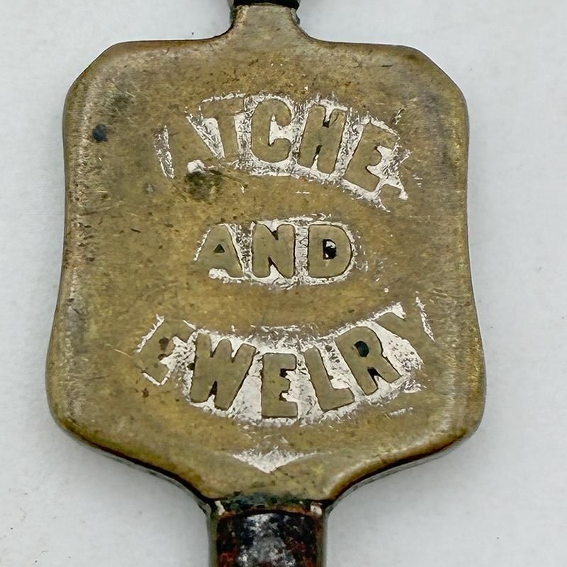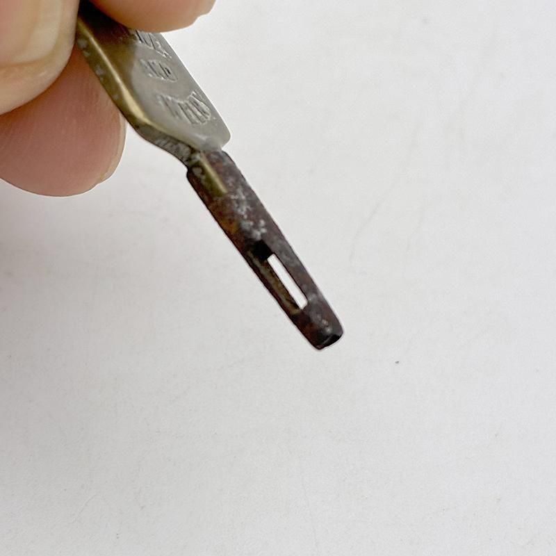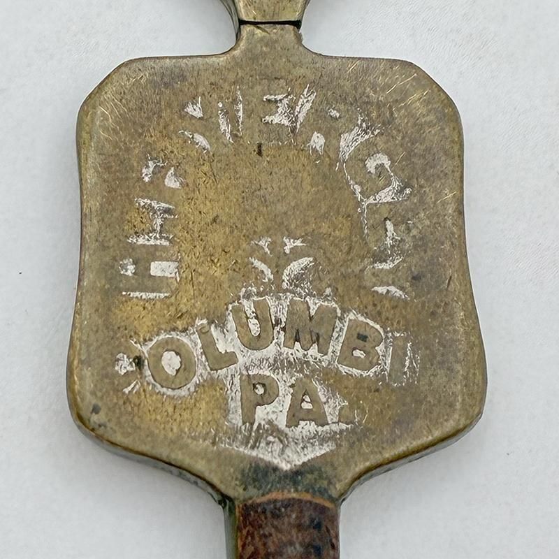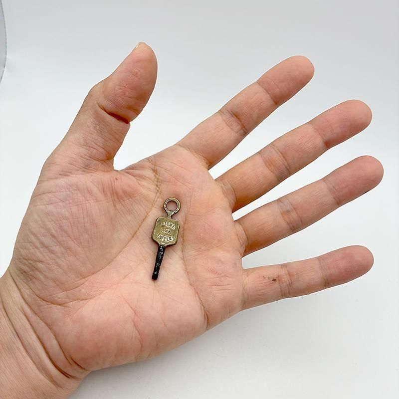 懐中時計のゼンマイ巻き上げなどに使われていたパーツで"H.F. YERGEY WATCH AND JEWELRY" 1870年頃からのアメリカ ペンシルバニア州コロンビアにあった宝石商のアドバタイジングが入っています。