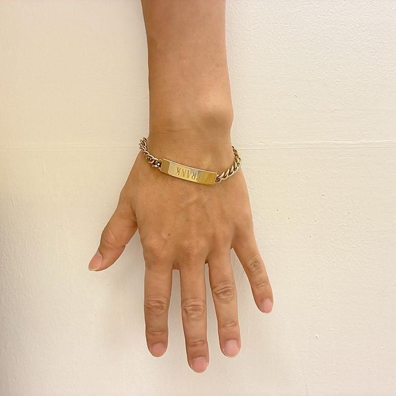 スクエア型のプレートに喜平チェーンがセットされたブレスレットです。