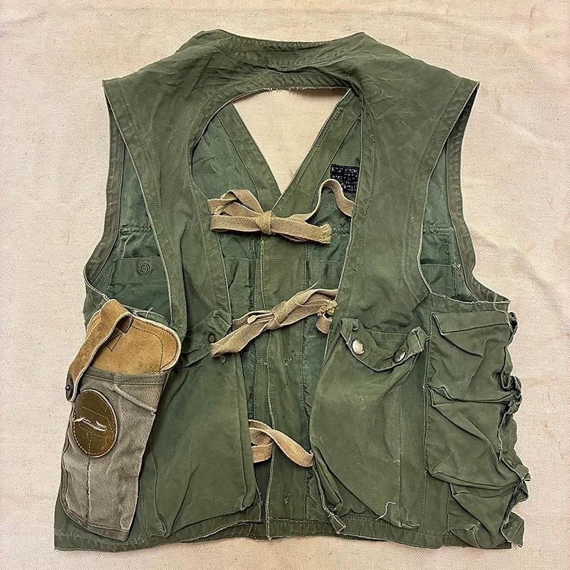フライトジャケットの上から装着していたサバイバルベストでフロント、バック、内側の様々な形状のポケットにパイロットが不時着に必要な道具が収められていました。