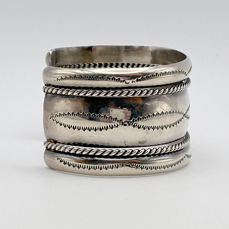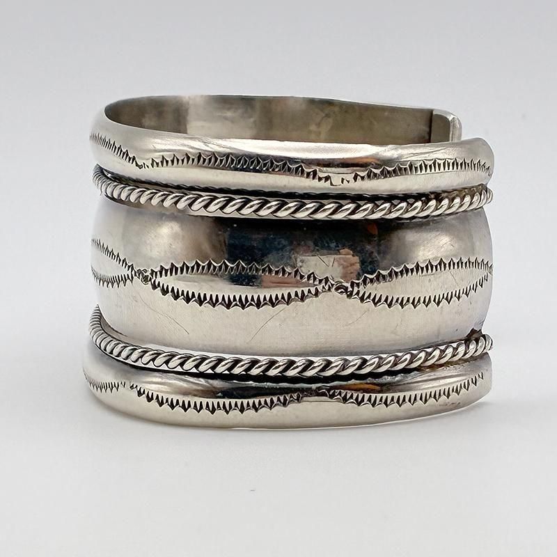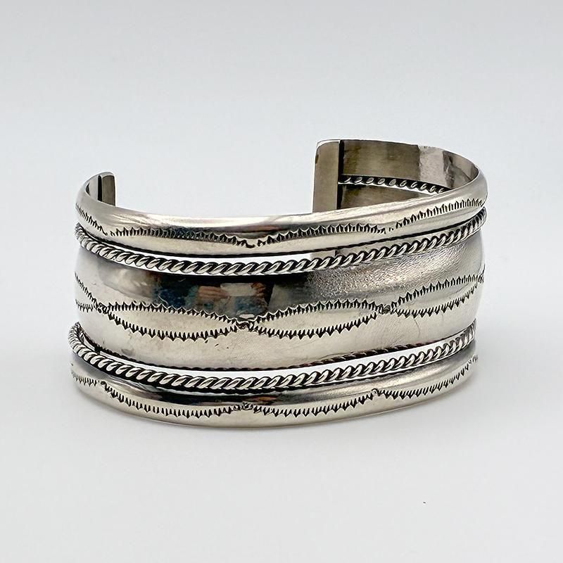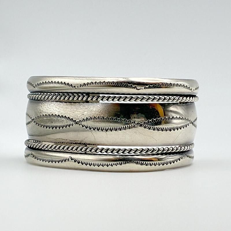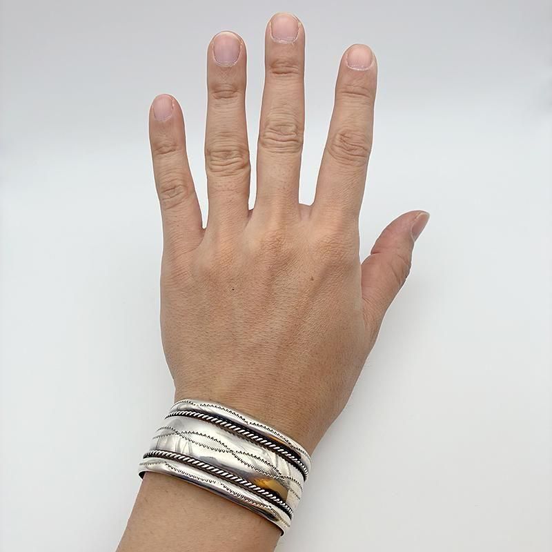 ワイヤーワークの入った5層の構造のバングルで、中央の太いラインと端のラインにスタンプワークが入っています。
