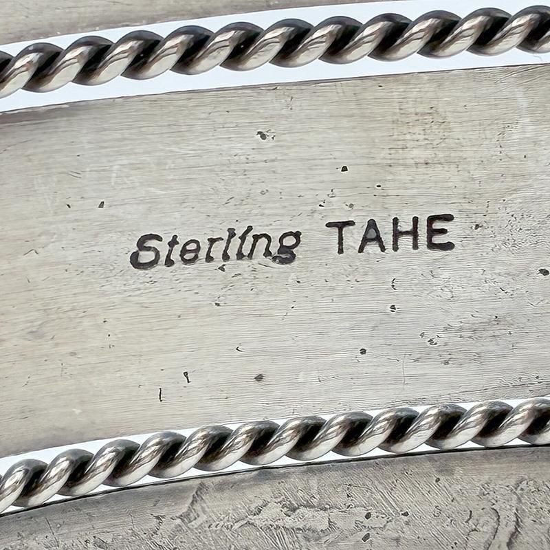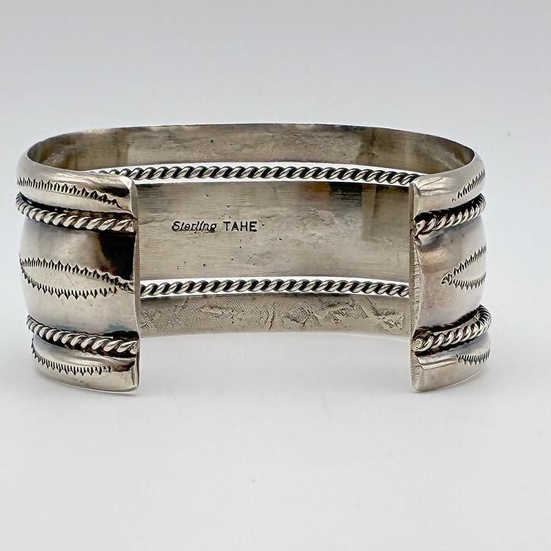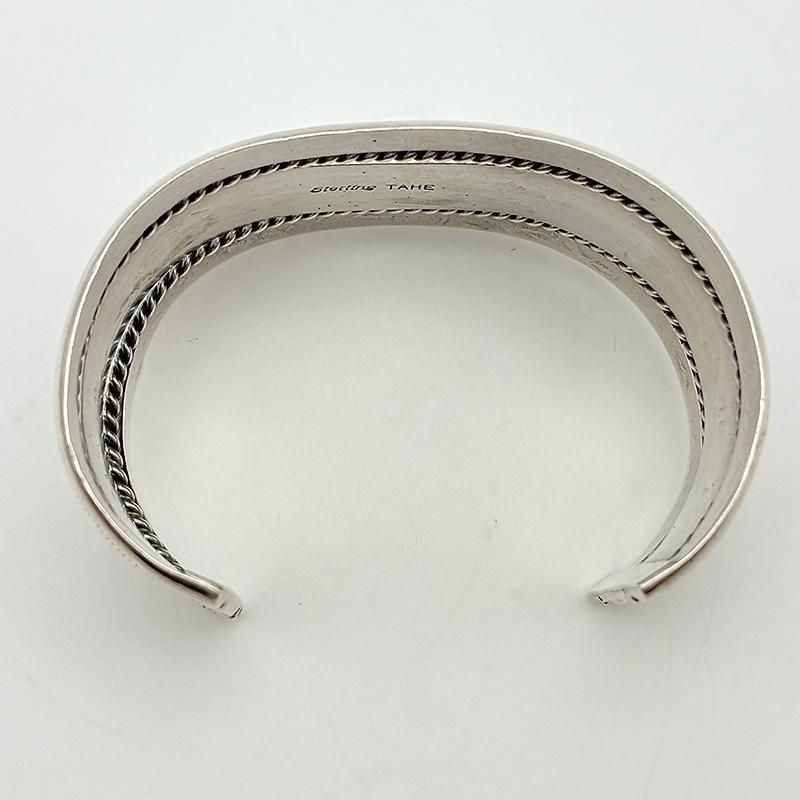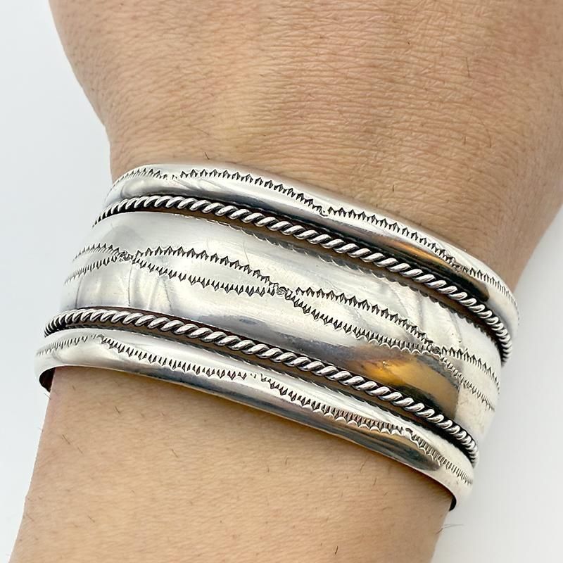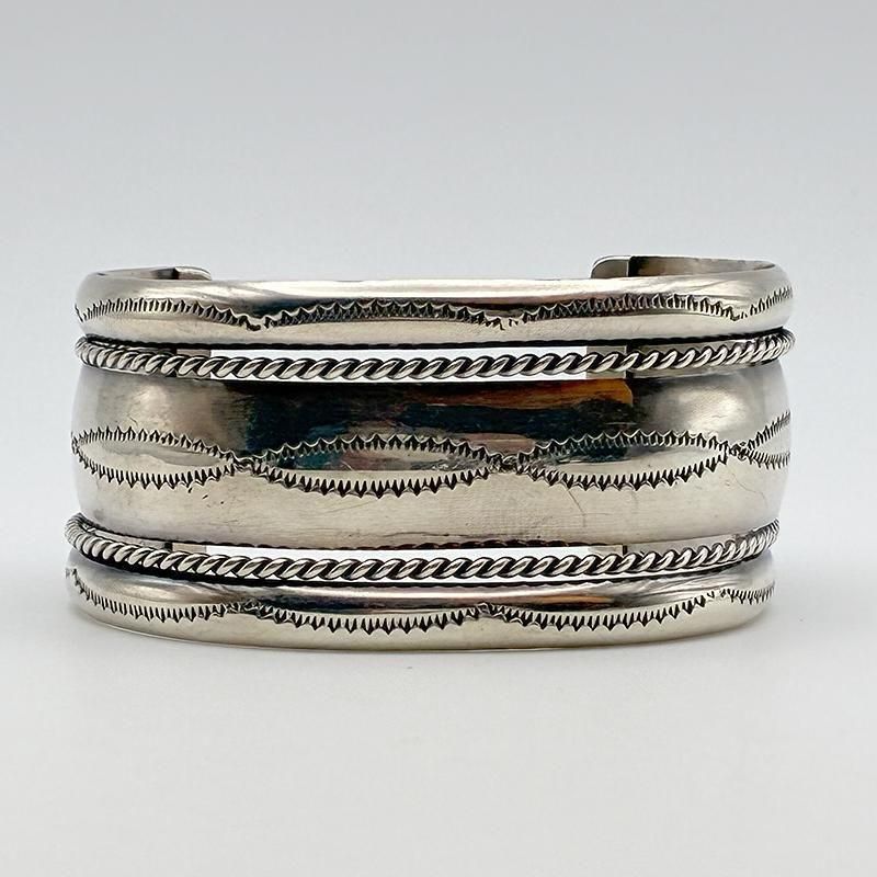 ワイヤーワークの入った5層の構造のバングルで、中央の太いラインと端のラインにスタンプワークが入っています。