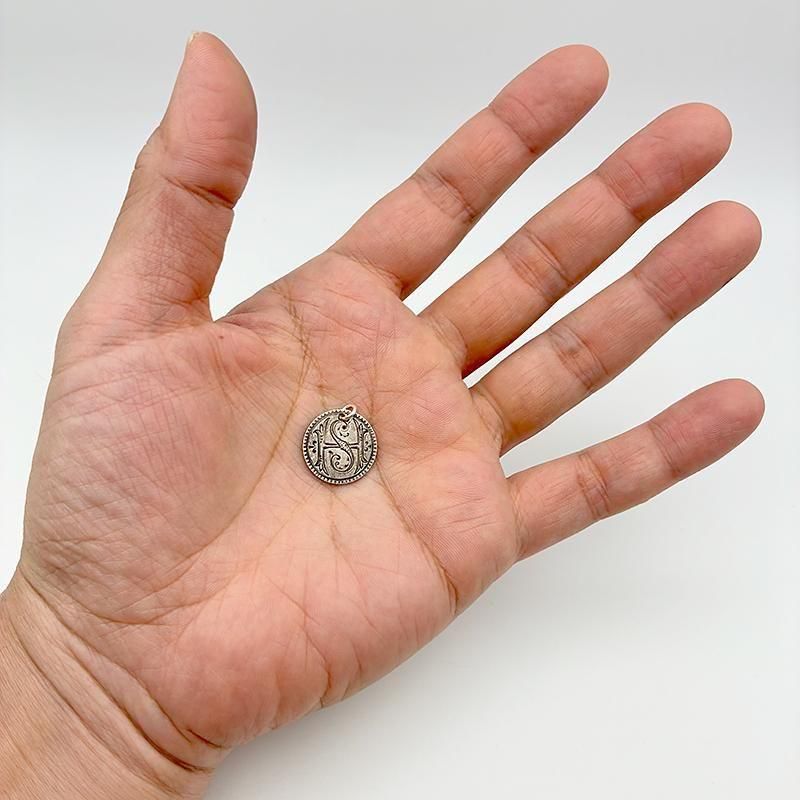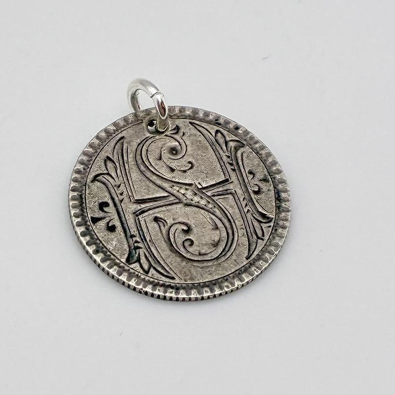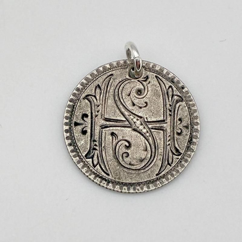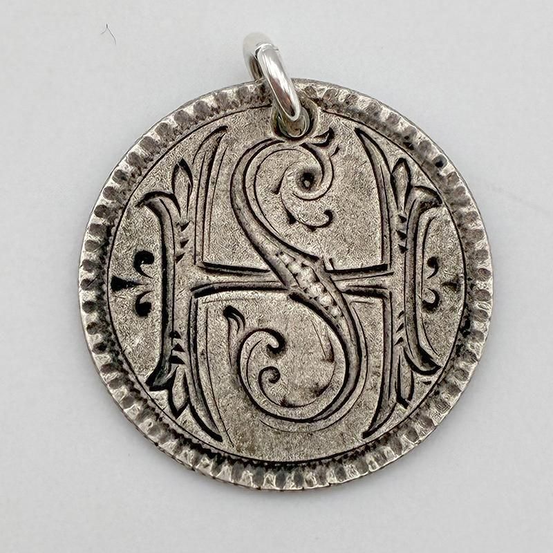 コインの裏面を削って平にし、そこにHSのイニシャルを彫刻しています。