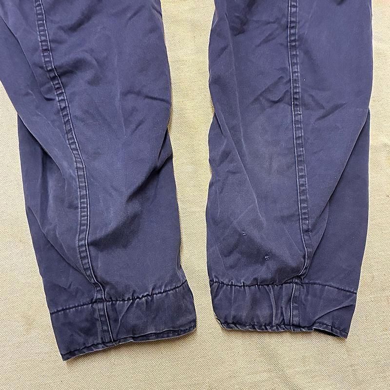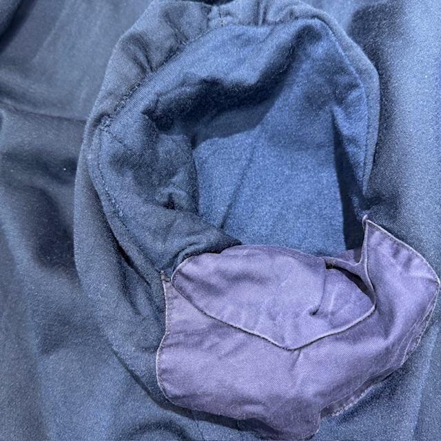 ネイビーカラーにフロントジッパーフライ+ボタン止めのフラップに筒袖。