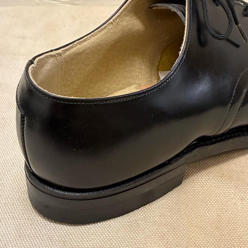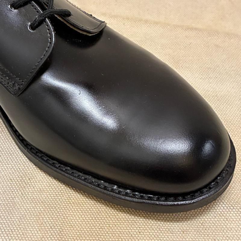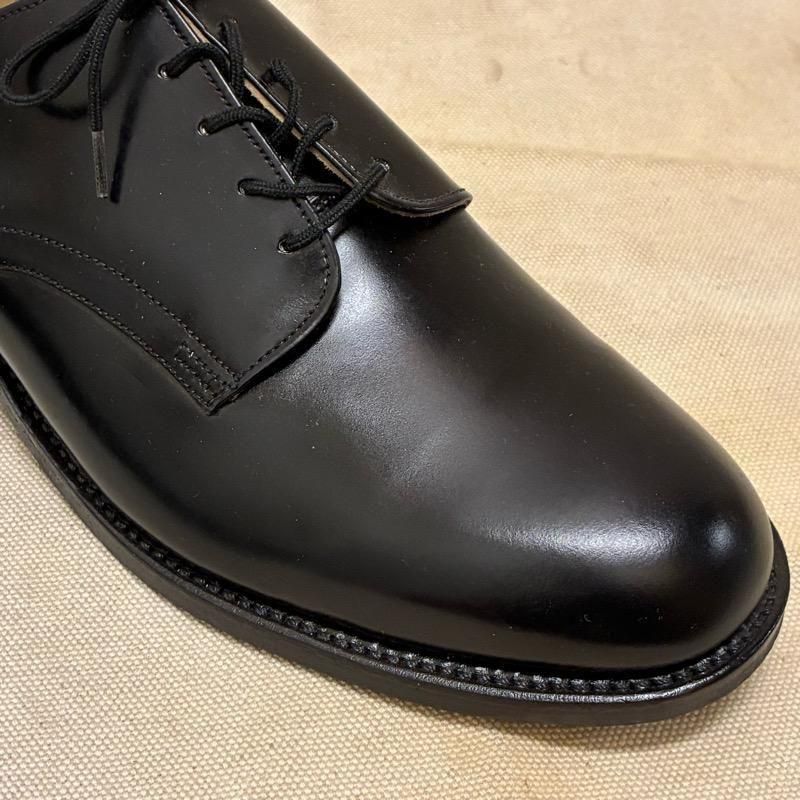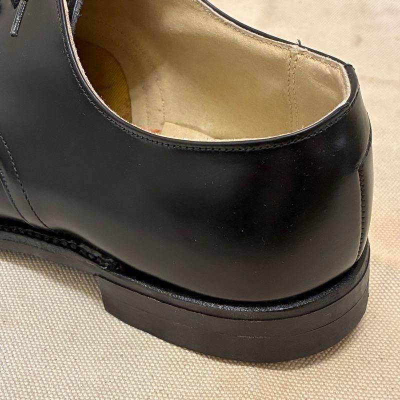 5穴のプレーントゥ、ラバーソールで使いやすいシンプルなブラックレザーシューズです。