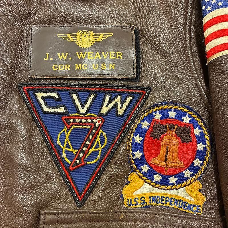 左胸にレザーネームプレート、ベルクロ着脱タイプ。搭乗艦 USS INDIPENDENCEと所属部隊第7空母航空団のパッチ。