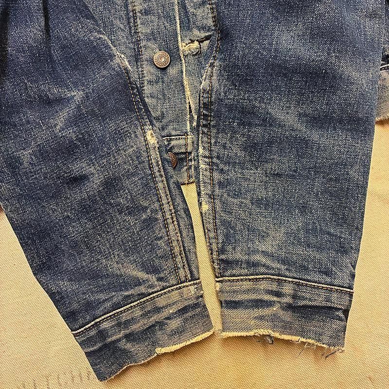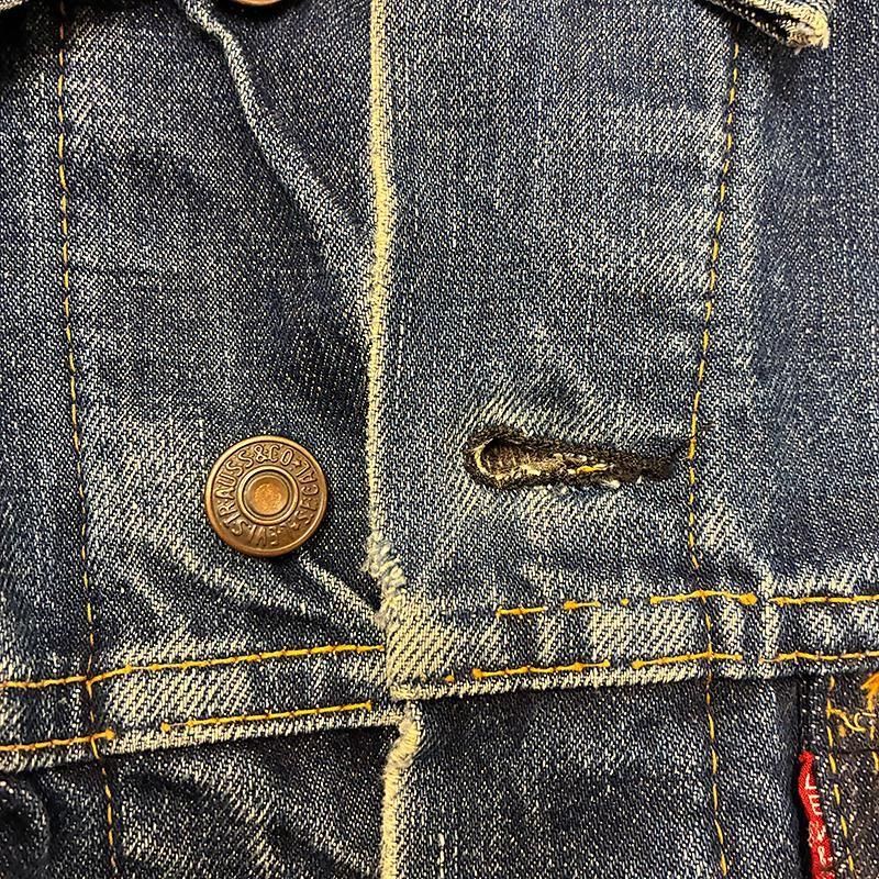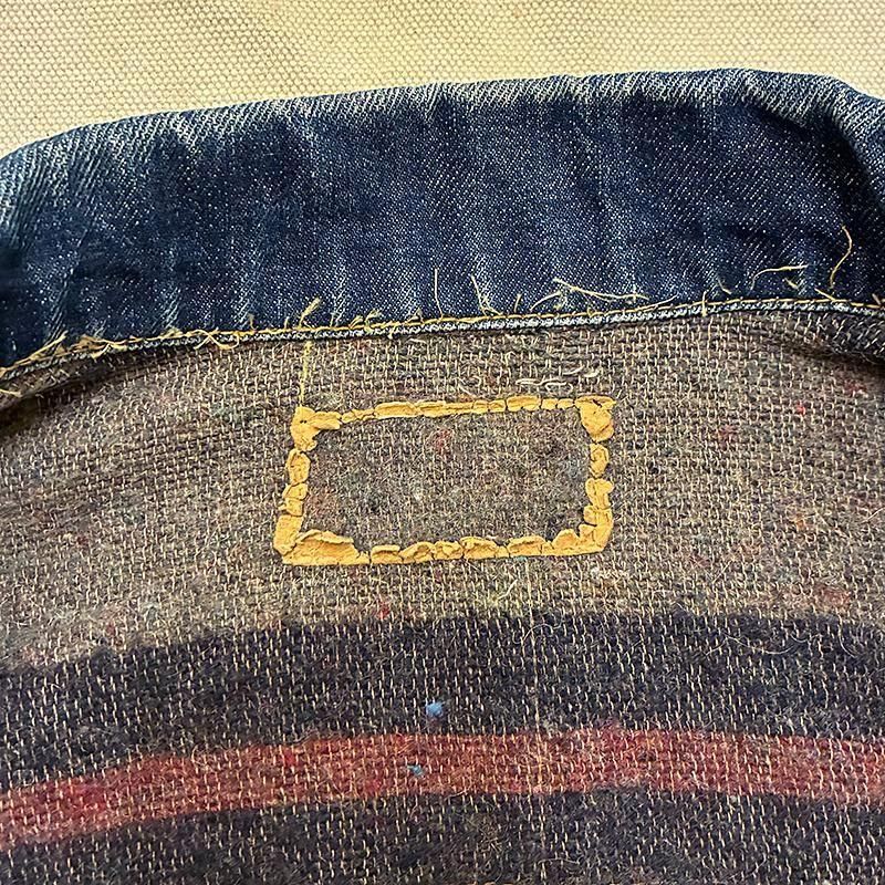 襟と両胸ポケットフラップにもパッチか当て生地が縫い付けられてたようですが外されており、その部分だけデニムの色が濃く残っています。(背中ハーレーパッチ部分もステッチが外れた個所から覗くと色濃く残っています。)