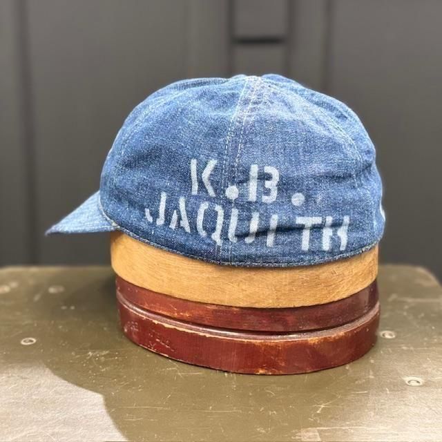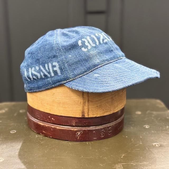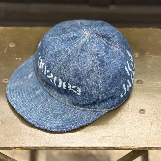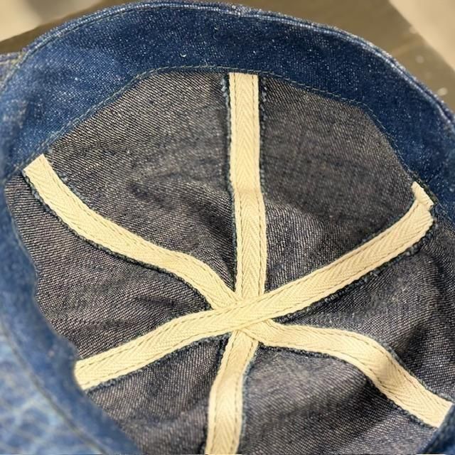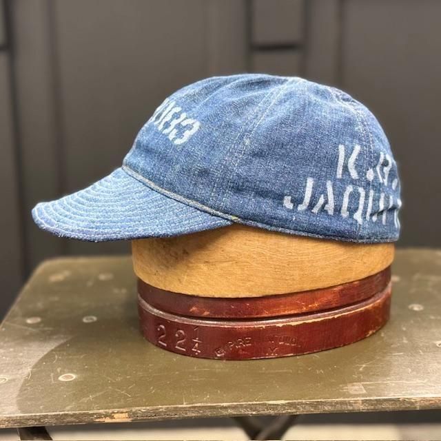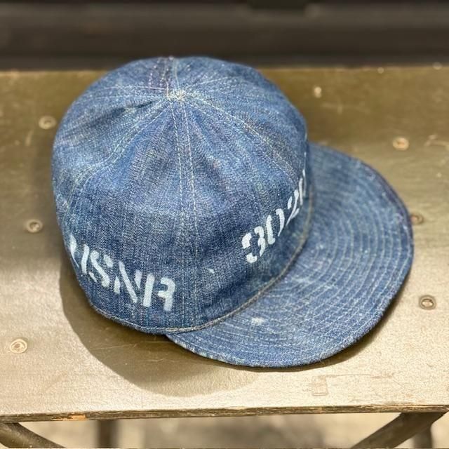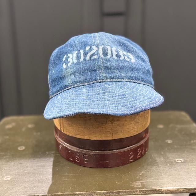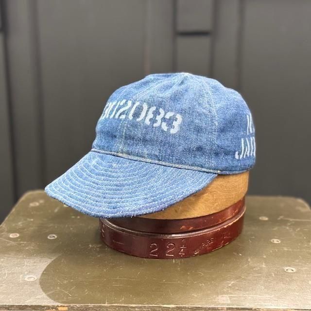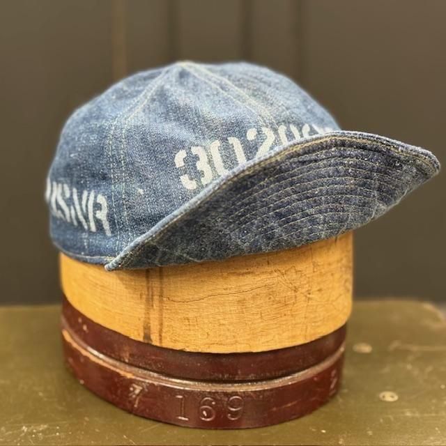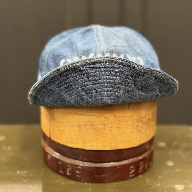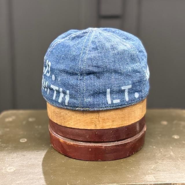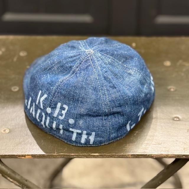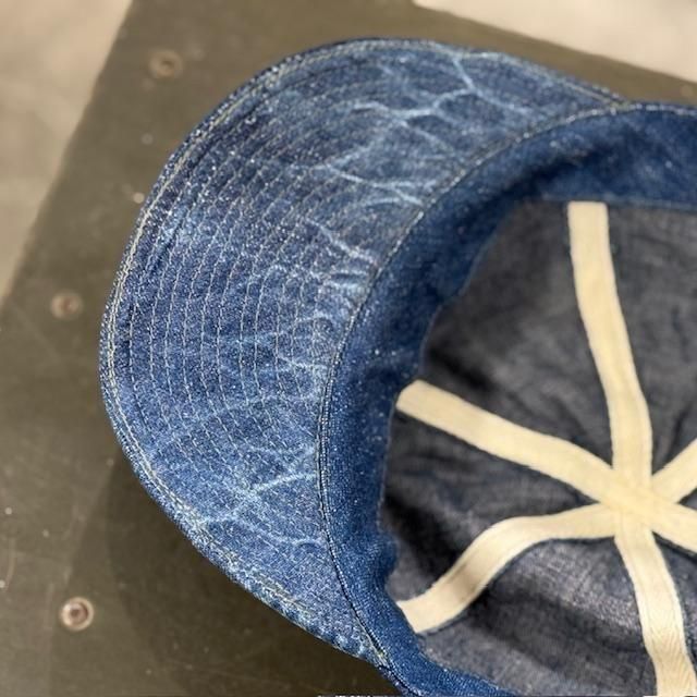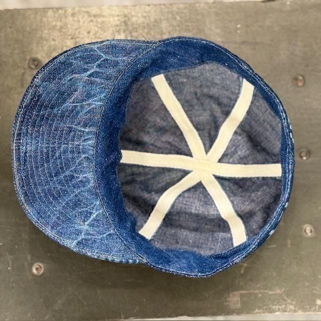 サーチライト オリジナルのデニムキャップ。30-40s頃のアメリカ軍デニムバラックバッグ(通称ランドリーバッグ)を解体して製作しました。