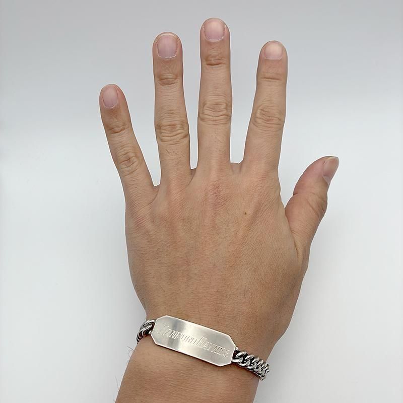 角の取れたスクエア型のプレートに喜平チェーンがセットされたブレスレット。