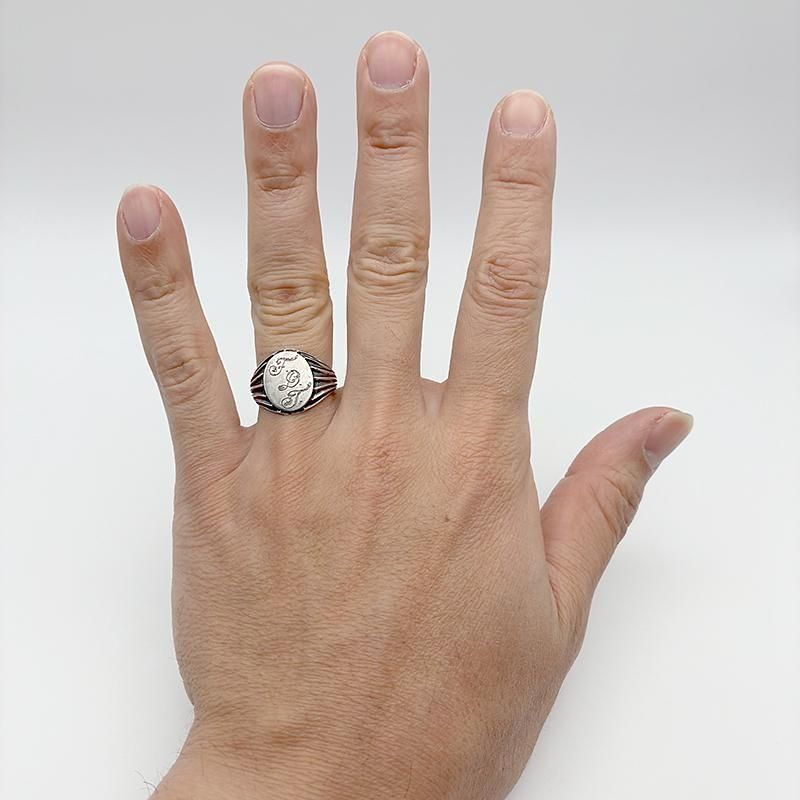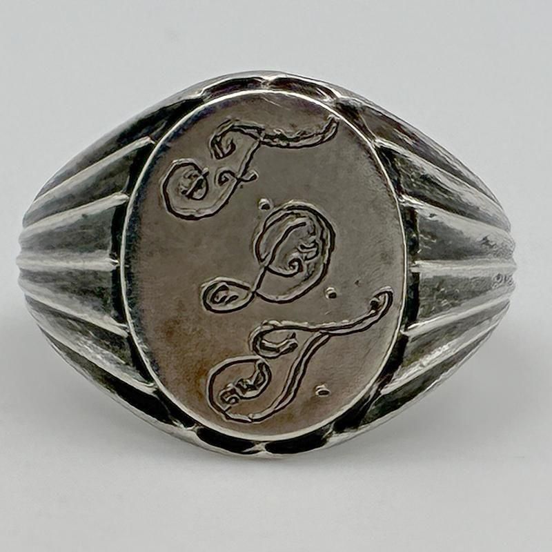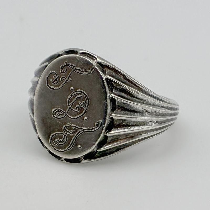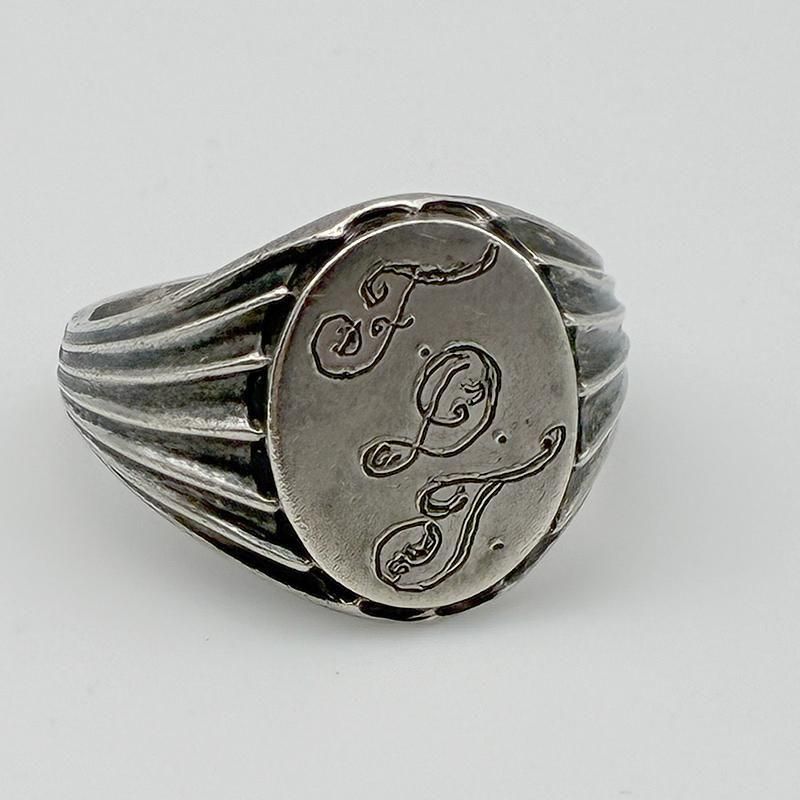 オーバル型のトップにイニシャル FDT が味のある手彫りオールドイングリッシュで彫刻されています。
