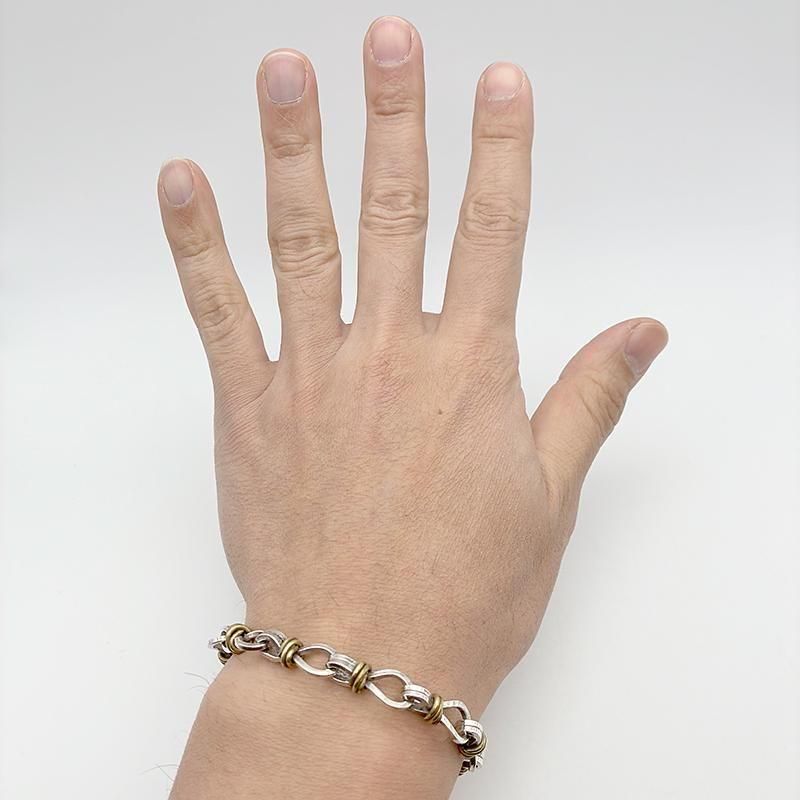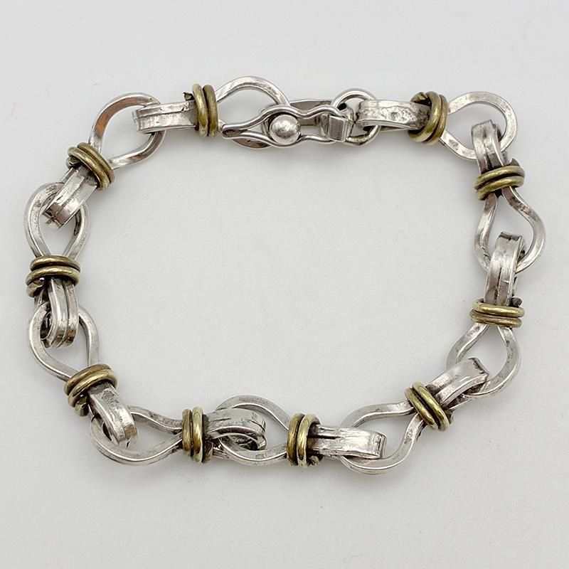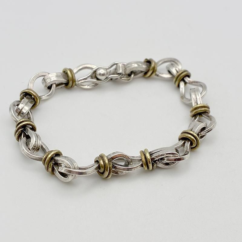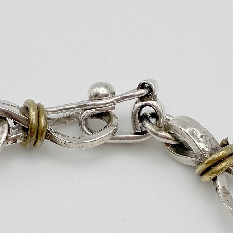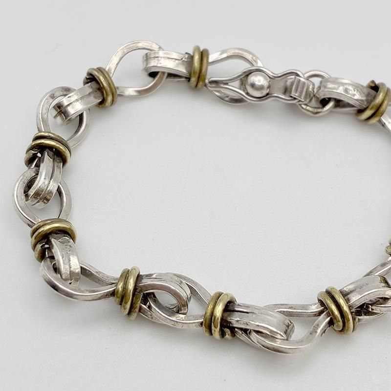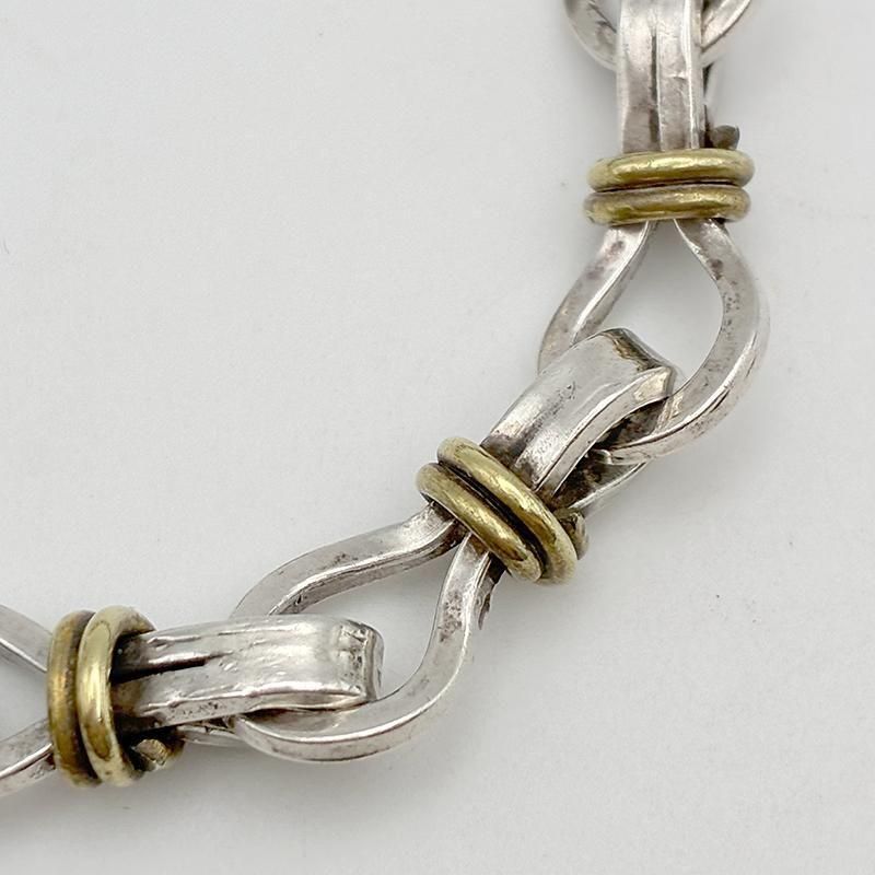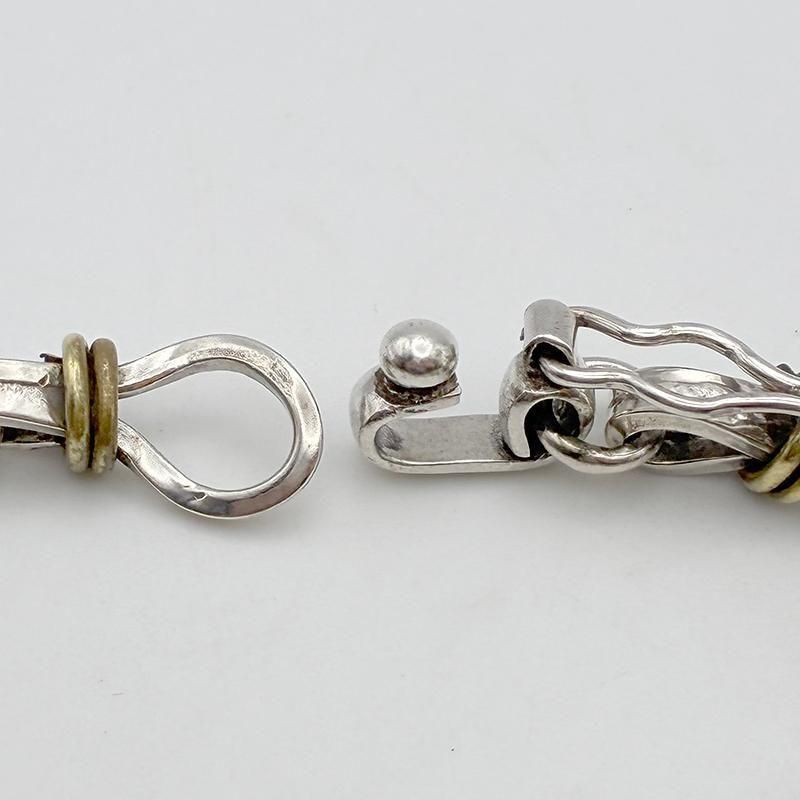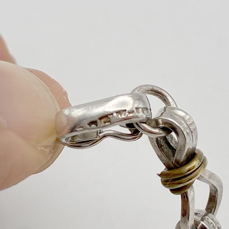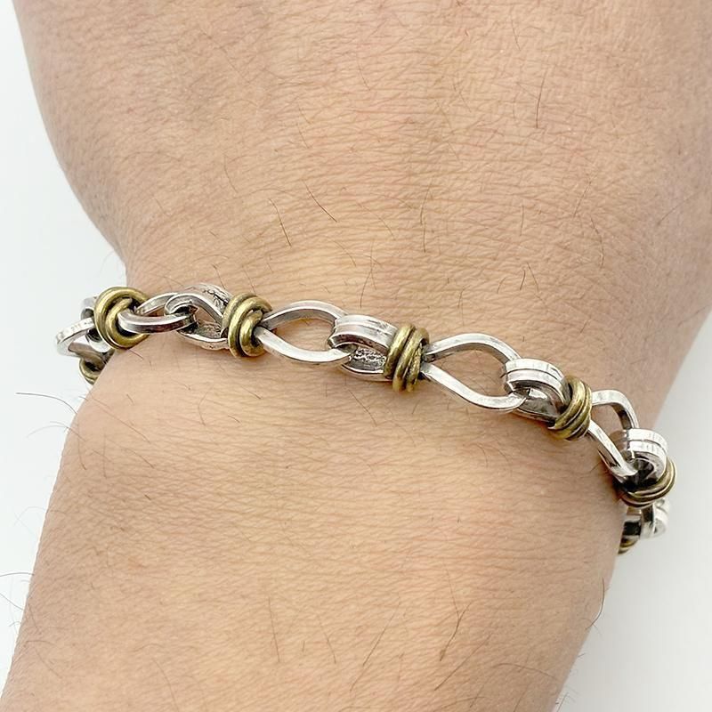 チェーンはツイストしたリングの中央にブラスのワイアを巻きつけたコマが連なるデザインです。