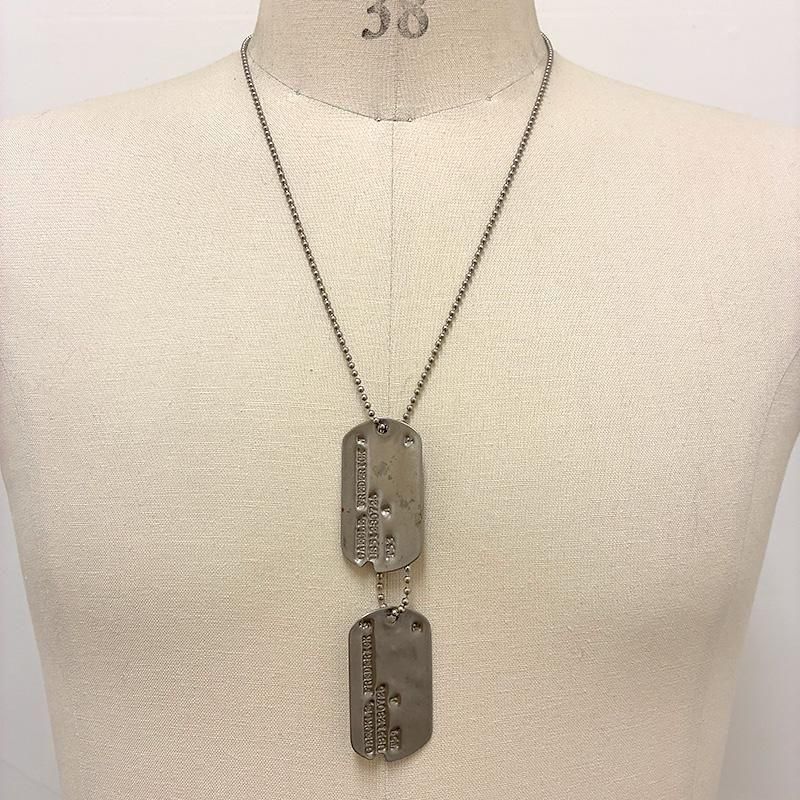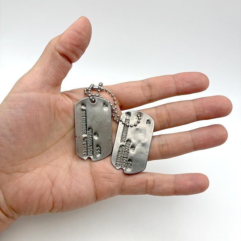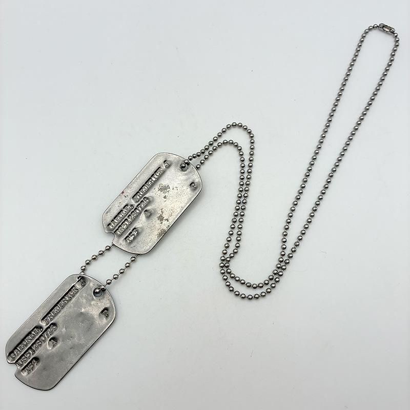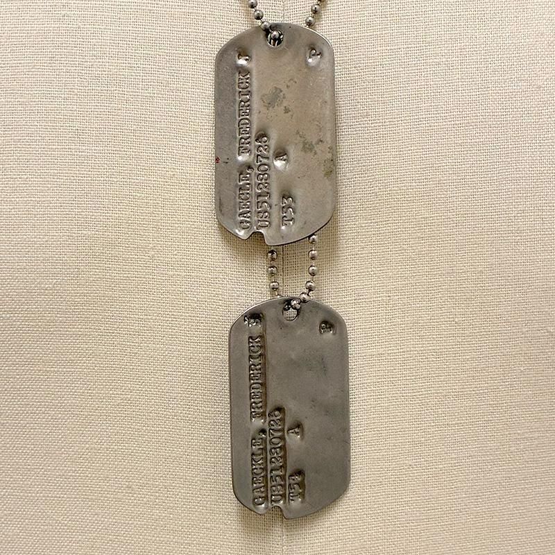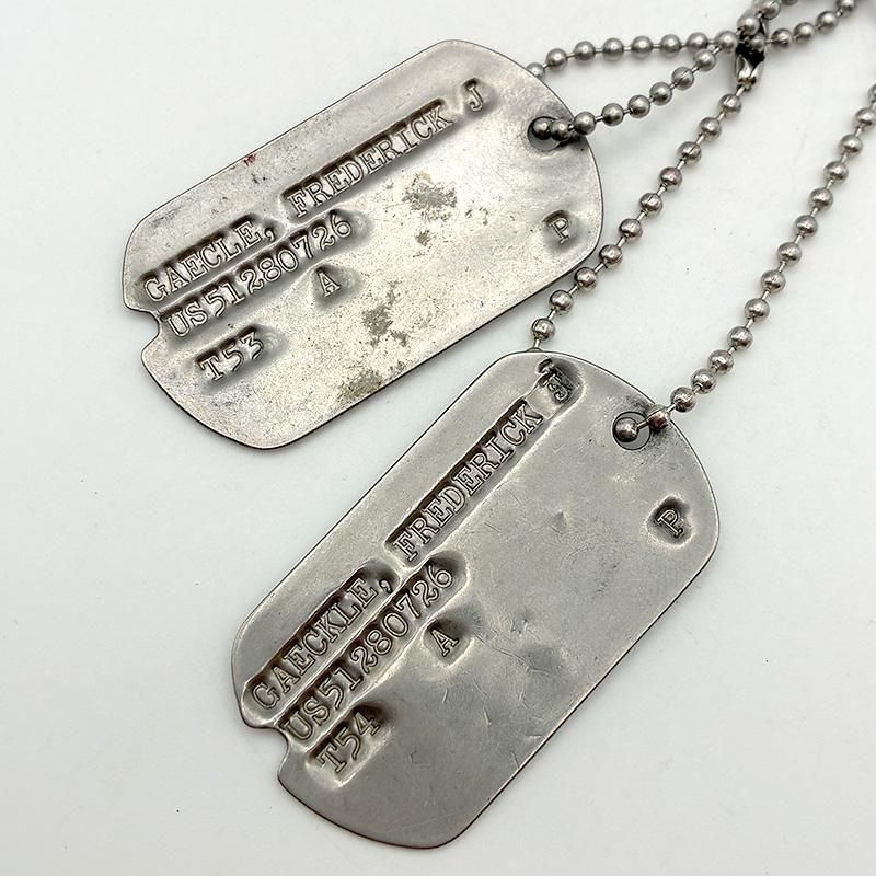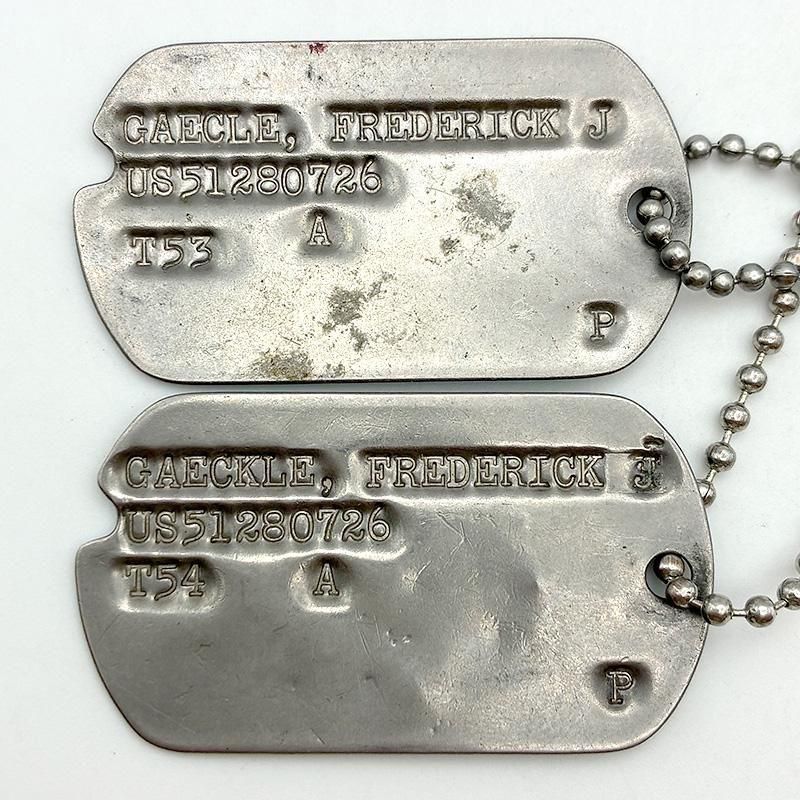 ドッグタグにはネーム "GAECLE, FREDERICK J"と認識番号US51280726 破傷風予防接種年T53 血液型A 宗教P(プロテスタント) が4段で打刻されています。