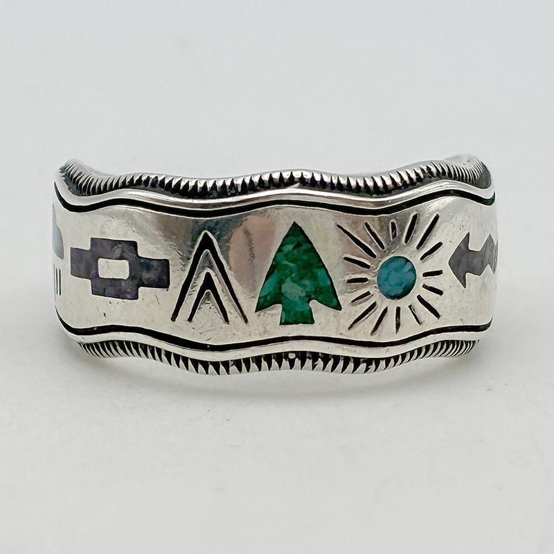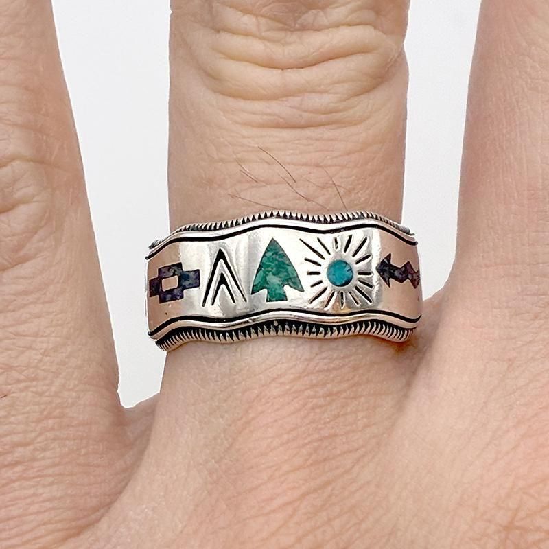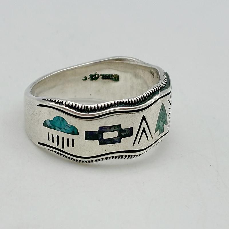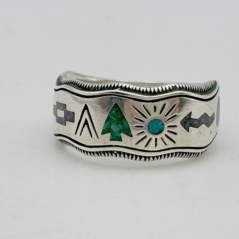 波打ったデザインのリングに7つのネイティブアメリカンシンボルがデザインされています。