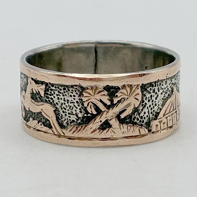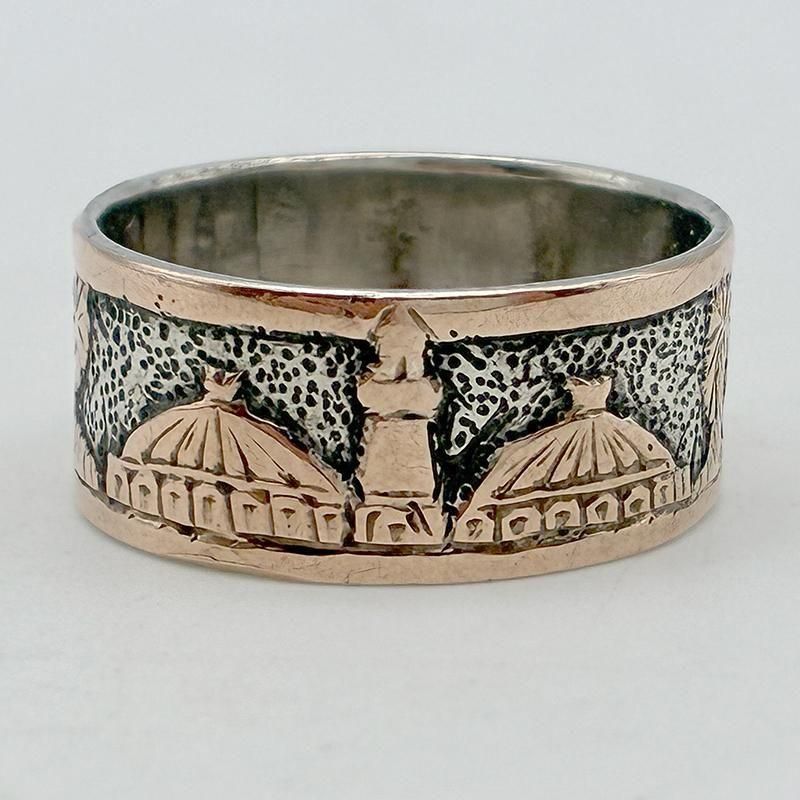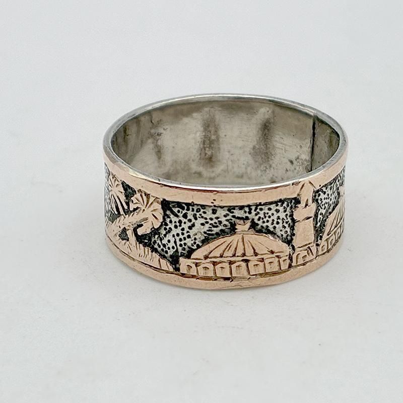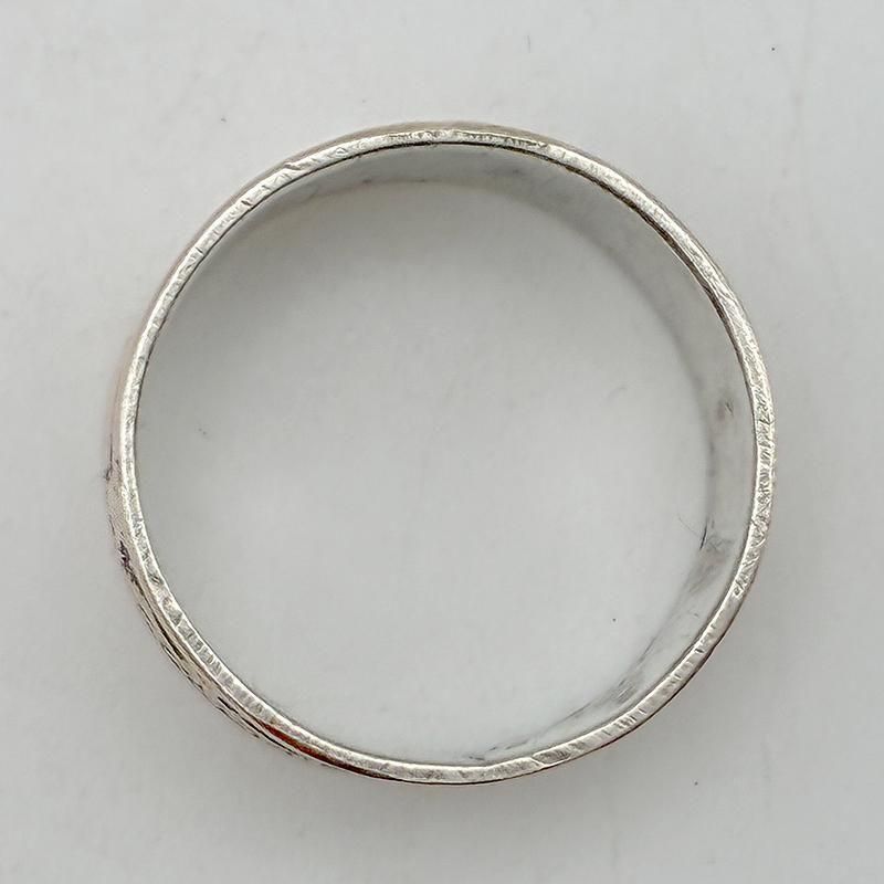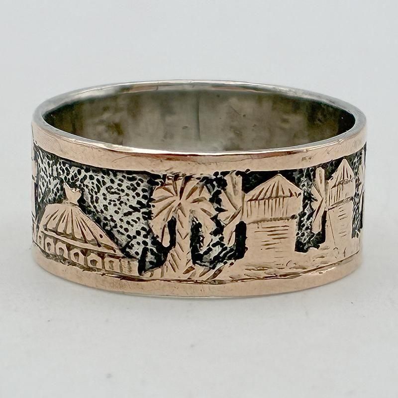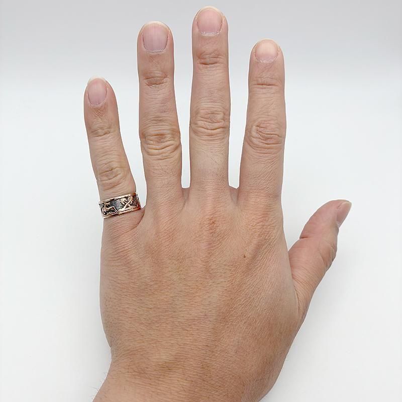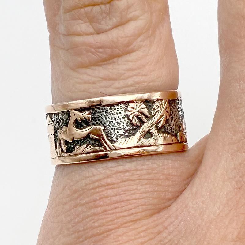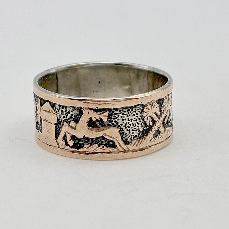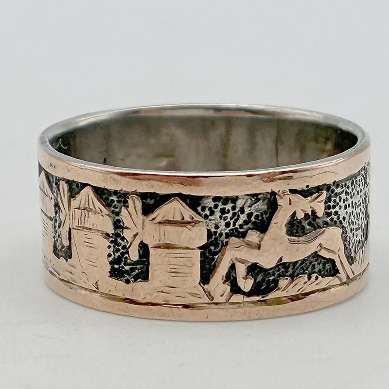 中央あたりに鹿、木や建物等がデザインされているネイティブアメリカンリング。